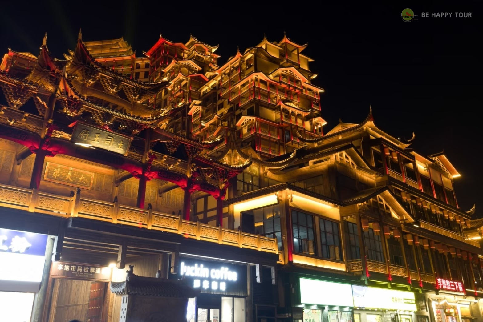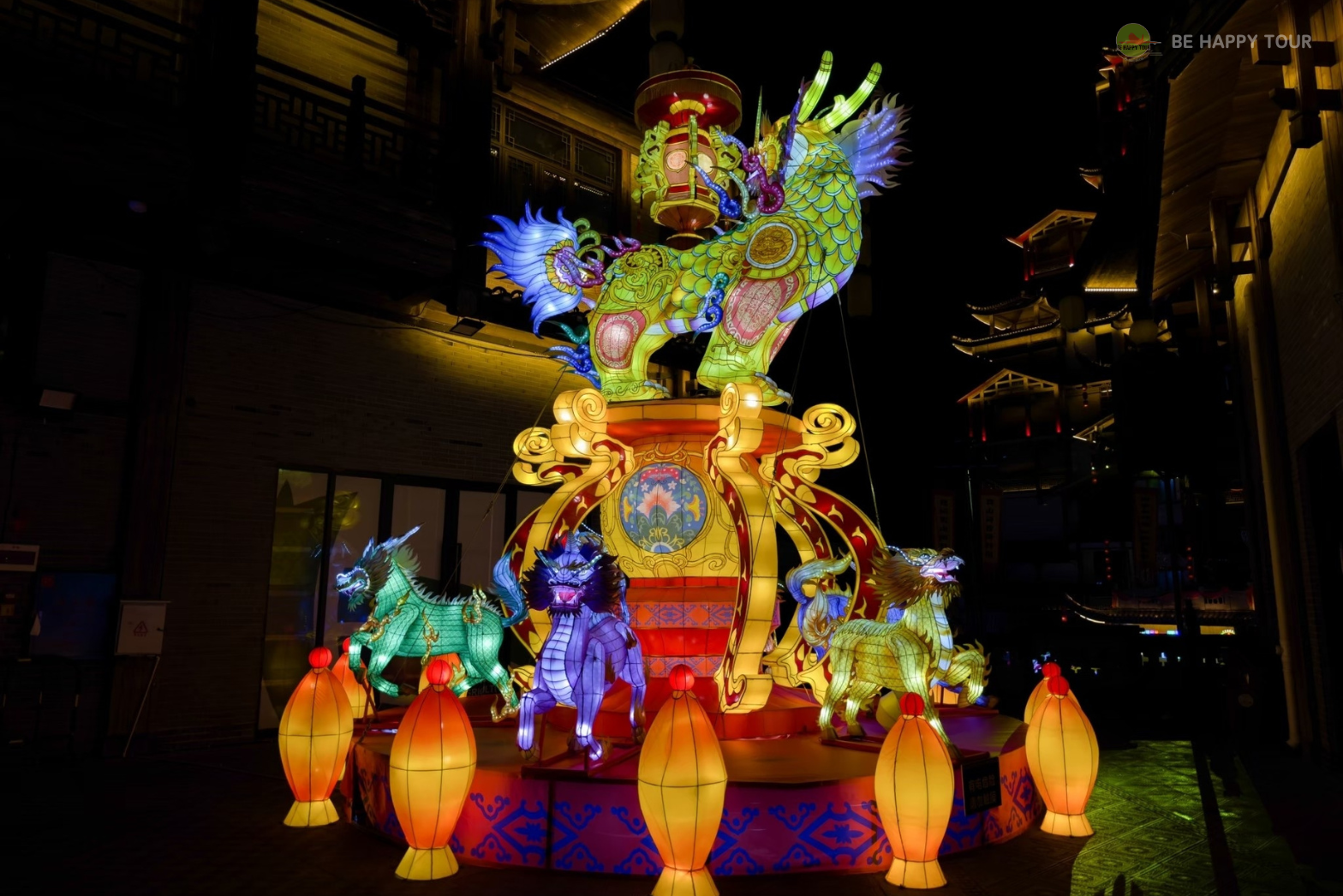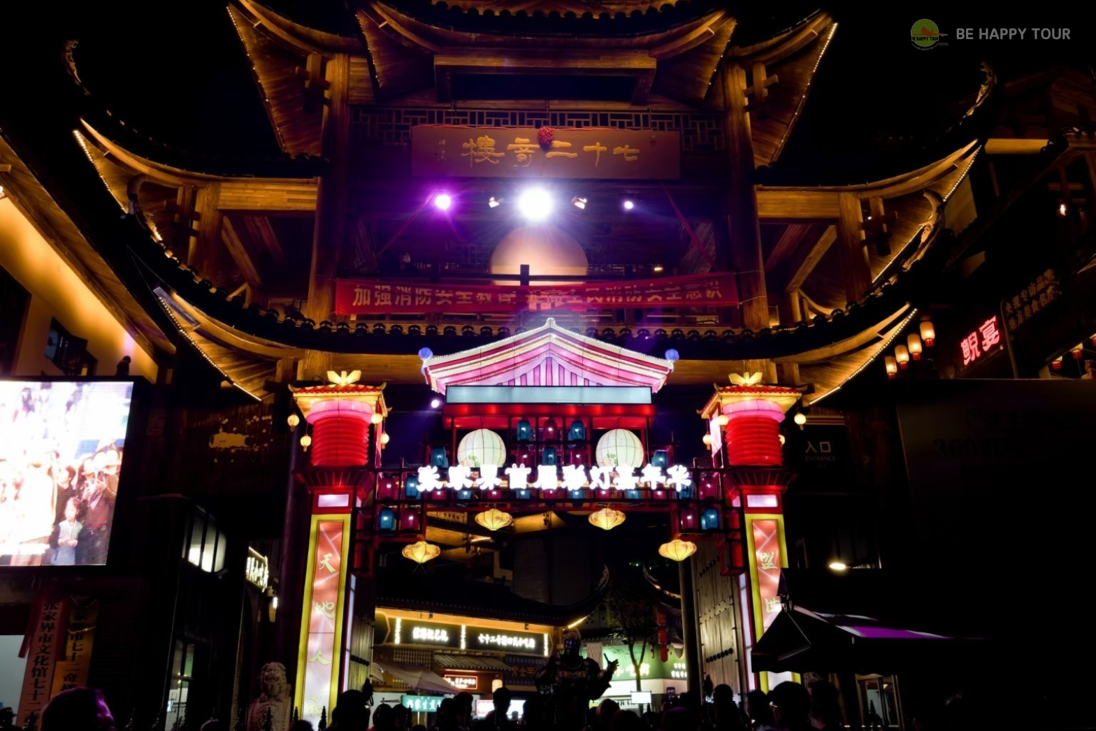 ช่วงค่ำ ตัวอาคารได้เปิดไฟ แสง สี สว่างไสว สวยงามมากๆ ก่อนทางเข้าก็จะมีร้านขนม ร้านขายของมากมาย บริเวณด้านนอกจะพบประติมากรรมรูปมังกรพันเสา มีกลองขนาดใหญ่เหมือนกลองศึกบนยกพื้นสูง เป็นฉากหลัง และยังมีการแสดงตีกลอง ผู้แสดงจะเป็นผู้ชายในเครื่องแต่งกายสวยงาม