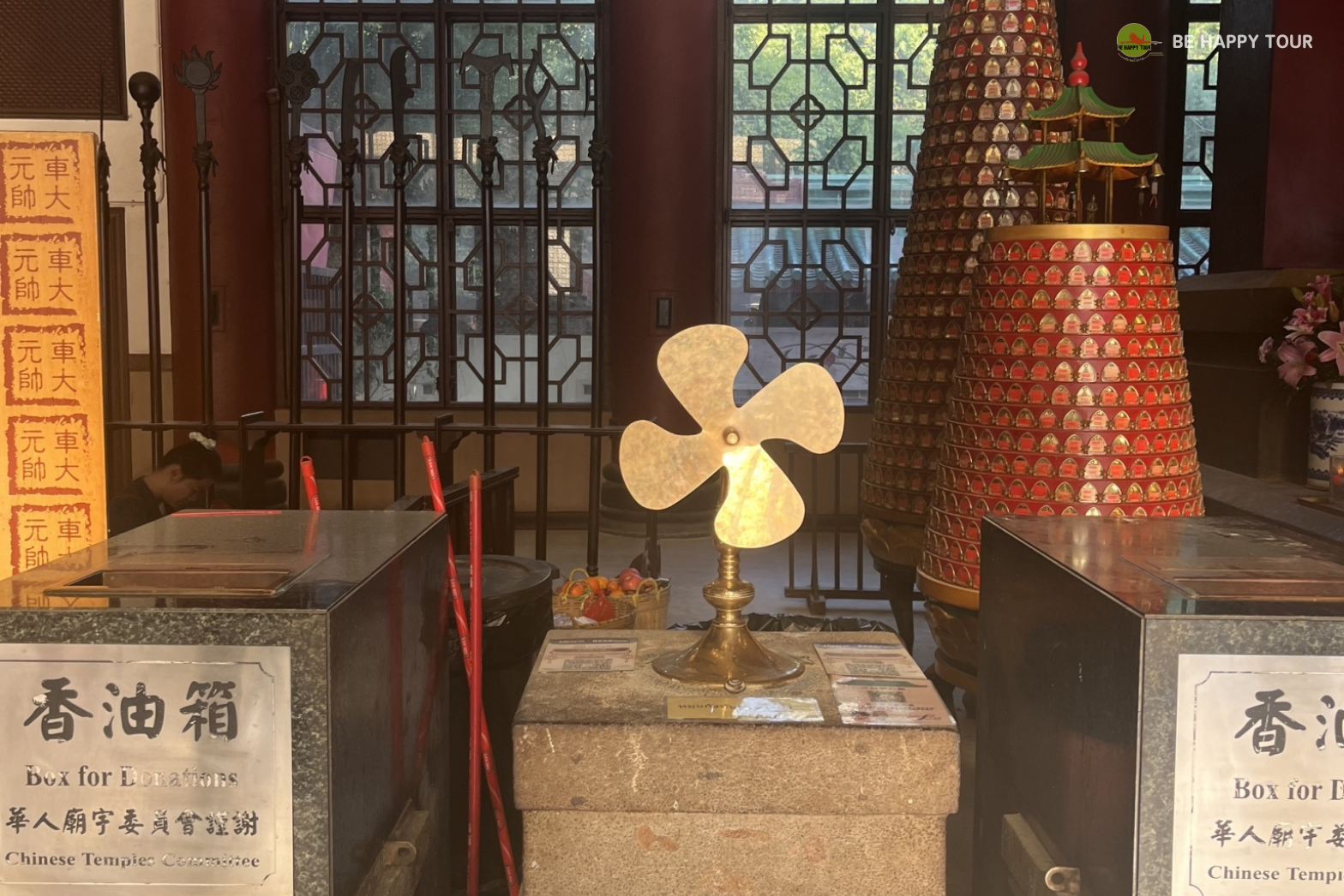 จากนั้นค่อยไปหมุนกังหัน ตั้งจิตอธิษฐานแล้วใช้มือหมุนกังหัน 3 ครั้ง ตีกลองที่อยู่ข้าง ๆ อีก 3 ครั้ง คนฮ่องกงเชื่อว่าเป็นการขจัดปัดเป่าสิ่งไม่ดีให้ออกไปแล้วนำพาแต่สิ่งดีเข้ามาในชีวิต
