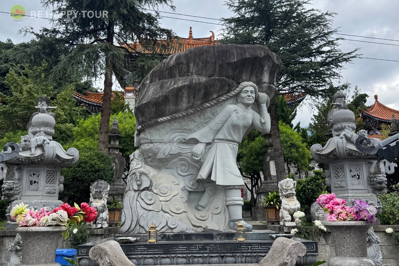 ตำนานกล่าวว่า ตอนเมืองต้าหลี่ถูกรุกราน ทหารต่างแดนบุกมาถึงหน้าเมือง เห็นหญิงขราแบกก้อนหินใหญ่ขวางสะพานไว้ ทหารข้าศึกเห็นหญิงชราสามารถแบกหินก้อนโตได้ เกรงว่าชายฉกรรย์ในเมืองจะแข็งแรงยิ่งกว่านี้ จึงถอนทัพทำให้เมืองต้าหลี่ รอดพ้นจากภัยสงครามไปได้ ชาวบ้านเล่ากันว่า หญิงชรานั้น คือ เจ้าแม่กวนอิมมาโปรด จึงสร้างศาลเจ้าไว้บูชา และ มีก้อนหินนั้นตั้งอยู่กลางศาลเจ้าด้วย