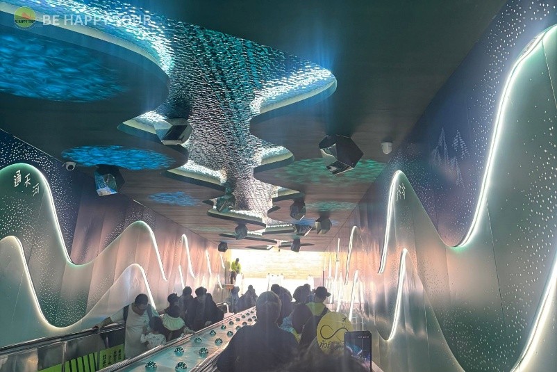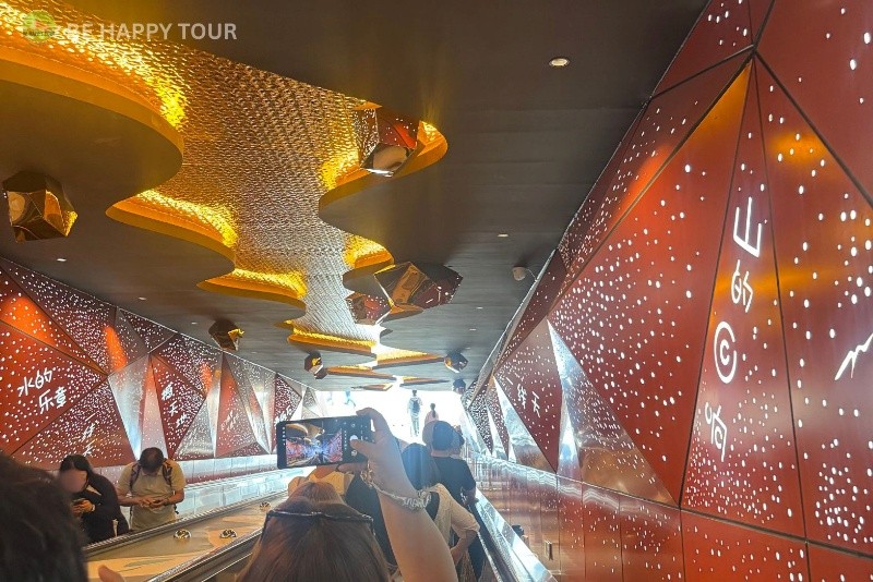 ทางลงบันไดไปจะเป็นลานถ่ายรูป ก่อนที่จะเลือกลงบันไดเลื่อน (ค่าบันไดเลื่อน ไป-กลับ 70 หยวน/คน) หรือ ถ้าใครชอบเดินชมบรรยากาศ ก็สามารถเดินลงบันไดได้ บันไดมีทั้งหมดประมาณ 2,000 ขั้น จะมีช่วงพัก เป็นลานแวะพักสามารถถ่ายรูปและวิวสวยๆ