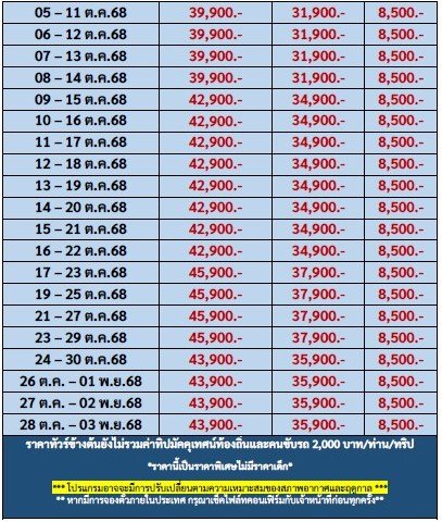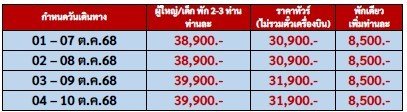 เดินทาง ต.ค. 68 | โดยสายการบิน THAI AIRWAYS (TG) | • ภูเขาสี่ดรุณี ซวงเฉียวโกว (รวมรถอุทยาน) • อุทยานปี้เผิงโกว (รวมรถอุทยาน) • ภูผาหิมะกลาเซียร์ต๋ากู่ปิงชวน (รวมกระเช้าขึ้น-ลง) • อุทยานแห่งชาติจิ่วจ้ายโกว (ใช้รถเวียนของอุทยาน) • นั่งรถไฟความเร็วสูงสู่เมืองเฉิงตู • ถนนคนเดินชุนซีลู่ +ร้าน POP MART • ถนนไท่กู่หลี่ • ถนนโบราณซอยกว้างซอยแคบ+ร้าน POP MART *เมนูพิเศษสุกี้หมาล่าเสฉวน