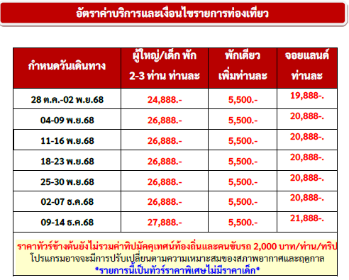 เดินทาง ต.ค. - ธ.ค. 68 | โดยสายการบิน AIR ASIA (FD) | • วัดหลัวฮั่น • เมืองโบราณสือชีโข่ว • อู่หลง • อุทยานเขานางฟ้า (รวมรถราง) • อุทยานหลุมบ่อฟ้า+สะพานสวรรค์ (รวมลงลิฟต์แก้ว+รถอุทยาน+รถกอล์ฟ) • จุดชมวิวระเบียงแก้ว • ชมวิวหงหยาต้ง • นั่งรถไฟฟ้าทะลุตึก • ศาลาประชาคม (ด้านนอก) • รถไฟความเร็วสูงสู่เฉิงตู-ตูเจียงเยี่ยน • จตุรัสหย่างเทียนวู่ • รูปปั้นแพนด้าเซลฟี่ • สะพานหนานเฉียว+ชมการแสดงแสงสี Blue Tears น้ำตาสีฟ้า • ตูเจียงเยี่ยน • สี่ดรุณี • อุทยานสี่ดรุณีหุบเขาซวงเฉียวโกว (รวมรถอุทยาน) • เฉินตู • วัดต้าฉือ • ถนนคนเดินชุนซีลู่ • ตึก IFS แพนด้ายักษ์ • POP MART • ถนนไท่กู่หลี่