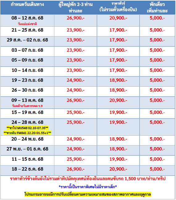 เดินทาง ส.ค. - ธ.ค. 68 | โดยสายการบิน CHINA EASTERN AIRLINES (MU) | • Yaoxue Ice and Snow World โลกน้ำแข็งสุดอลังการ ใจกลางเซี่ยงไฮ้! • Haichang Ocean Park สนุกสุดขีด กับโลกใต้ทะเลและโชว์สุดตื่นตา! • เทียนจื่อฝาง ย่านอาร์ตชิคๆ เดินเพลิน ช้อปเพลิน! • วัดหลงหัว วัดเก่าแก่ สงบ งดงาม น่าเคารพสักการะ • อาคารพันต้นไม้ (Tian An 1000 Tree) • ถนนอู่คัง • North Bund Greenland • Starbucks Reserve Roastery • เทียนจื่อฝาง • ถนนนานกิง+POPMART • วัดหลงหัว • ตลาดร้อยปีเฉิงหวังเมี่ยว • Florentia Village Outlet