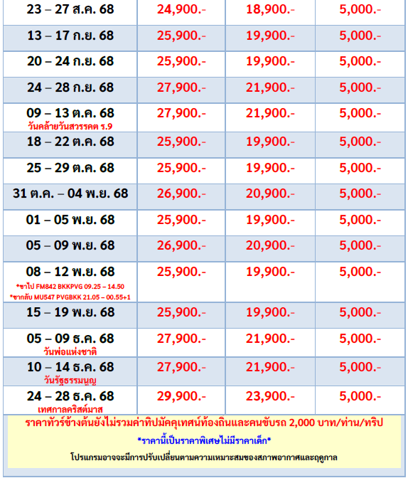 เดินทาง ส.ค. - ธ.ค. 68 | โดยสายการบิน SHANGHAI AIRLINE (FM) | • อู๋ซี • เมืองสงบงาม เยือนวัดเก่าแก่และวัฒนธรรมไหม ซูโจว • เมืองแห่งสวนจีนและลำคลองสุดโรแมนติก เซี่ยงไฮ้ • ช้อป ชิม ชิล ในมหานครทันสมัยแห่งจีน เพลิดเพลิน Disneyland Shanghai เต็มวัน (มีรถรับ-ส่ง) • วัดพระใหญ่หลิงซานต้าฝอ (รวมรถแบตเตอรี่) • ศาลาฝานกง • จัตุรัสหยวนหยง • ผ่านชม THE GATE OF THE ORIENT • ล่องเรือหมู่บ้านโบราณจูเจียเจี่ยว • หาดไว่ทาน • ถนนนานกิง + Popmart • อาคารพันต้นไม้ • Starbucks Reserve Roastery • ตลาดร้อยปีเฉิงหวังเมี่ยว • North Bund Greenland • ลอดอุโมงค์เลเซอร์ • Florentia Village Outlet