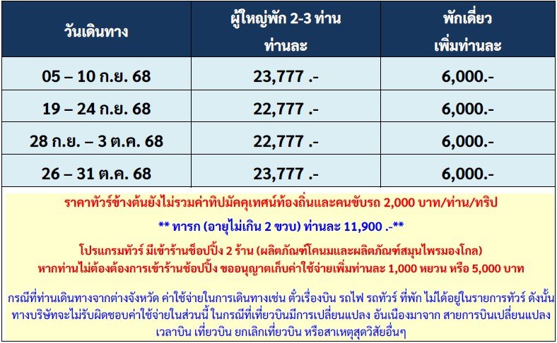 เดินทาง ก.ย. - ต.ค. 68 | โดยสายการบิน AIR ASIA (FD) | • ตะลุยภูเขาไฟอูลันฮาตา: ผจญภัยบนดินแดนที่ดูราวกับ "ดาวอังคารบนดิน" • นอนกระโจมกลางทุ่งหญ้าเออร์ดอส: สัมผัสวิถีชีวิตชาวมองโกลแท้ๆ พักผ่อนในกระโจมสมัยใหม่ที่สะดวกสบาย • ขี่อูฐชมเนินทรายเสี่ยงซาวาน: ฟัง "เสียงเพลงแห่งทะเลทราย" ที่เกิดจากลมพัดผ่านผืนทรายอันกว้างใหญ่ • เยือนสุสานเจงกิสข่าน: สัมผัสความยิ่งใหญ่ของมหาจักรพรรดินักรบแห่งมองโกล