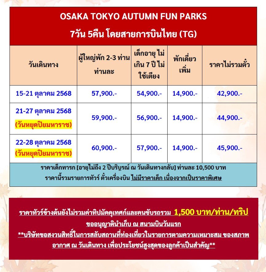 OSAKA TOKYO AUTUMN FUN PARKS 7 วัน 5 คืน (TG) (OCT25)