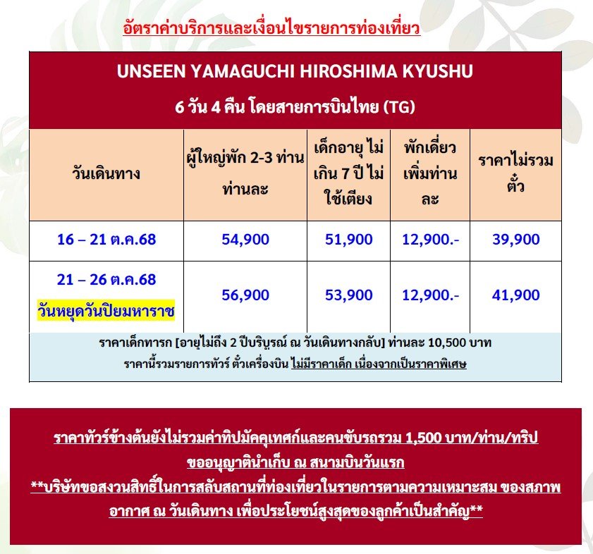 เดินทาง ต.ค. 68 | โดยสายการบิน THAI AIRWAYS (TG) | • อนุสรณ์สถานสันติภาพฮิโรชิมะ • สะพานที่สวยงามที่สุดในญี่ปุ่น สะพานคินไตเคียว • ประตูสีแดงกลางน้ำ “โอโทริอิ” อันเลื่องชื่อ ศาลเจ้าอิสึคุชิมะ • เข้า – ออก ฟุกุโอกะ • ถ้ำอากิโยชิได • ศาลเจ้าโมโตโนสุมิ อินาริ • นั่งเรือเฟอร์รี่สู่เกาะมิยาจิม่า • ศาลเจ้าโฮฟุ เทมมังกู • แหล่งข้อปปิ้งริมแม่น้ำ ริเวอร์วอล์ค คิตะคิวชู • วัดนันโซอิน • กันดั๊ม ปาร์ค ฟุกุโอกะ • ช้อปปิ้งย่านเทนจิน • พักออนเซ็น 1 คืน