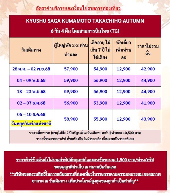 เดินทาง ต.ค. - ธ.ค. 68 | โดยสายการบิน THAI AIRWAYS (TG) | • ชมความงดงามของทิวทัศน์ ช่องแคบทาคาจิโฮะ • จุดชมใบไม้เปลี่ยนสี ป่าแห่งศิลปะสิ่งแวดล้อม • แสวงบุญที่ วัดนันโซอิน • วัดไดโคเซ็นจิ • ศาลเจ้ายูโทคุ อินาริ • หมู่บ้านโอคาวาจิยามะ • โทซุ พรีเมียม เอาท์เล็ท • ปราสาทคุมาโมโตะ • ซากุระโนะบาบะ โจไซเอ็น • ช้อปปิ้งชิโมะโทริ • กันดั๊ม ปาร์ค ฟุกุโอกะ • ช้อปปิ้งเทนจิน • พักออนเซ็น 1 คืน • พักคุมาโมโตะ 2 คืน