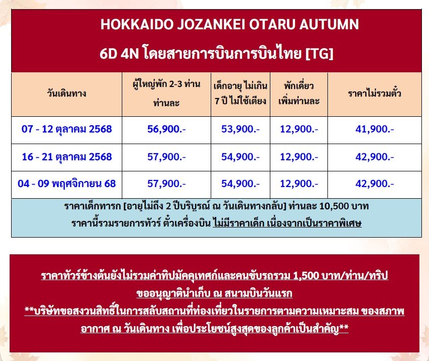 เดินทาง ต.ค. - พ.ย. 68 | โดยสายการบิน THAI AIRWAYS (TG) | • พักโจซังเค 1 คืน พร้อมชมใบไม้เปลี่ยนสี • พักโรงแรมในซัปโปโร 3 คืน • จุดชมใบไม้เปลี่ยนสีสะพานโจซังเคฟุทามิ • เมืองโรแมนติกของเกาะฮอกไกโด คลองโอตารุ • ขึ้นกระเช้า Mt.Usu Ropeway ชมวิวทะเลสาบโทยะ • อิสระท่องเที่ยว ช้อปปิ้งหนึ่งวันเต็มในซัปโปโร • หุบเขานรกจิโกกุดานิ • ภูเขาโชวะชินซัง • เขื่อนโฮเฮเคียว • พิพิธภัณฑ์กล่องดนตรี • ร้านกาแฟ ฮัลโหล คิตตี้ • ศาลเจ้าฮอกไกโด • ถนนต้นแปะก๊วยมหาวิทยาลัยฮอกไกโด • สวนลับฮิราโกะ • MITSUI OUTLET PARK SAPPORO • เนินเขาแห่งพระพุทธเจ้า • โมอายแห่งฮอกไกโด • ช้อปปิ้งถนนทานุกิโคจิ