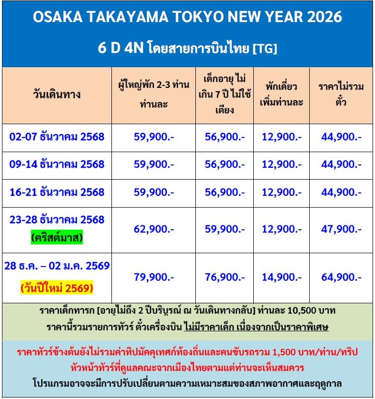 หมวดหมู่ : ทัวร์แนะนำ ,  ประเภททัวร์ ,  มีฟรีเดย์ ,  โดยสายการบิน ,  THAI AIRWAYS (TG) ,  วันรัฐธรรมนูญ ,  วันพ่อ ,  วันคริสต์มาส ,  ทัวร์เทศกาล ,  ทัวร์ปีใหม่ ,  Fuji ,  Gifu ,  Narita ,  Osaka ,  Takayama ,  Tokyo ,  Japan ,  Tokyo Osaka ,
