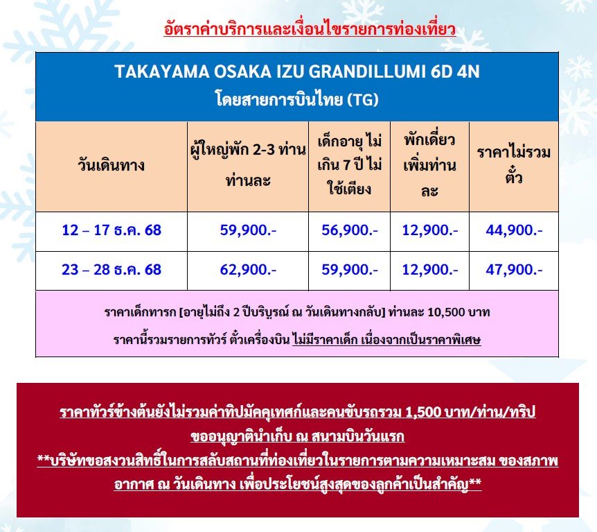 เดินทาง ธ.ค. 68 | โดยสายการบิน THAI AIRWAYS (TG) | • ชมงานประดับไฟ อิซุโคเก็น แกรนอิลูมิ • หมู่บ้านมรดกโลกชิราคาวาโกะ • ชมวิวภูเขาไฟฟูจิ • เมืองคามาคุระ • หลวงพ่อโต ไดบุตสึ • ภูเขาโอมูโระ • หมู่บ้านน้ำใส โอชิโนะฮักไก • ชมวิวฟูจิ ริมทะเลสาบคาวากุจิโกะ • ปราสาทมัตสึโมโต้ • เมืองทาคายาม่า • ช้อปปิ้งย่านซาคาเอะ • วัดเบียวโดอิน • ช้อปปิ้งโดตงโบริ • ช้อปปิ้งชินไซบาชิ • ศาลเจ้านัมบะ ยาซากะ • อิออน มอลล์ ริงกุ เซ็นนัน