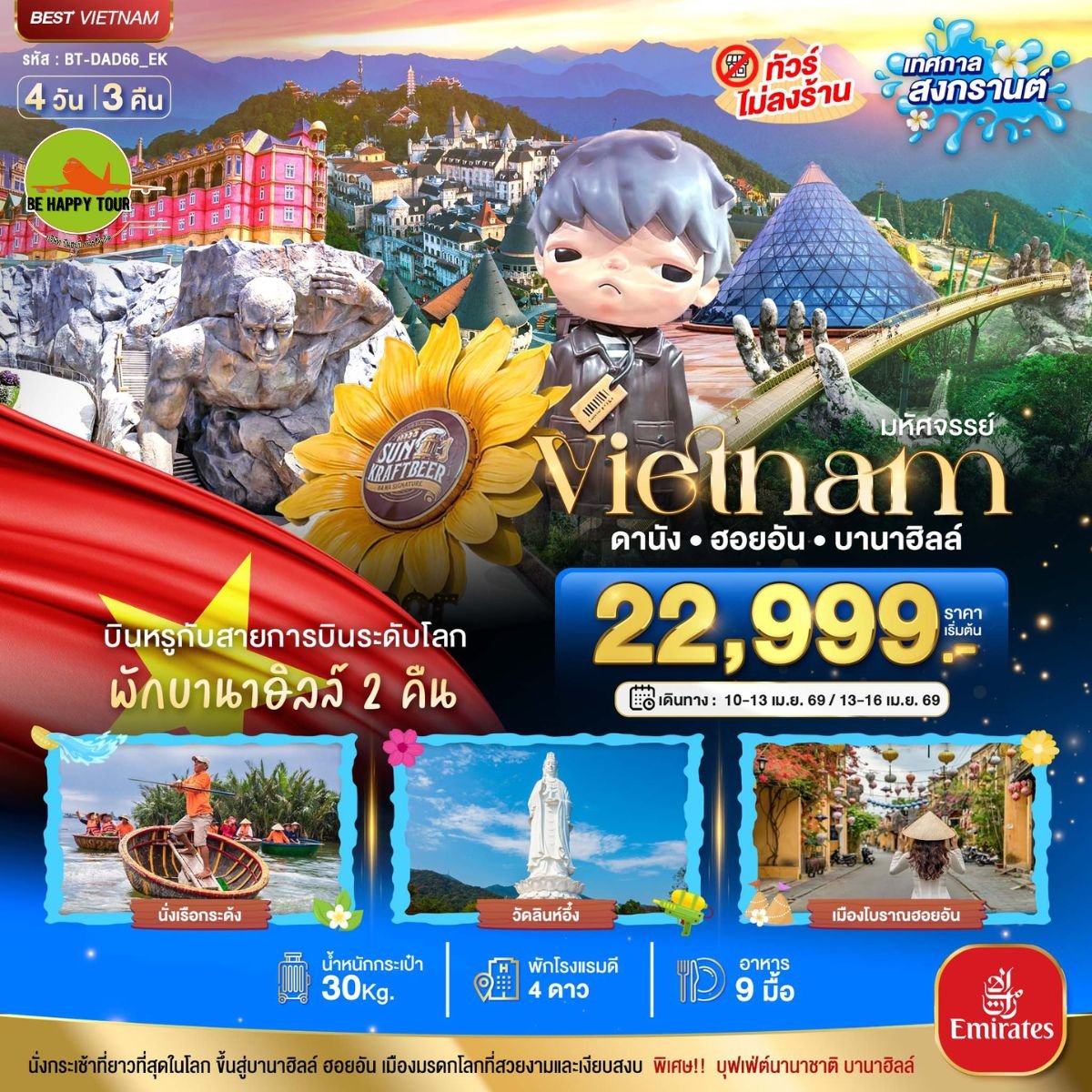 เดินทาง เม.ย. 69 | โดยสายการบิน EMIRATES (EK) | • วัดลินห์อึ๋ง • สะพานมังกร • Apec Park • นั่งกระเช้าไฟฟ้าขึ้นสู่บาน่าฮิลล์ • สะพานมือสีทอง • สวนสนุก The Fantasy Park • หมู่บ้านฝรั่งเศส • โซนใหม่ Eclipse Square • นั่งเรือกระด้ง • เมืองโบราณฮอยอัน • โบสถ์คริสต์ดานัง • ตลาดฮาน