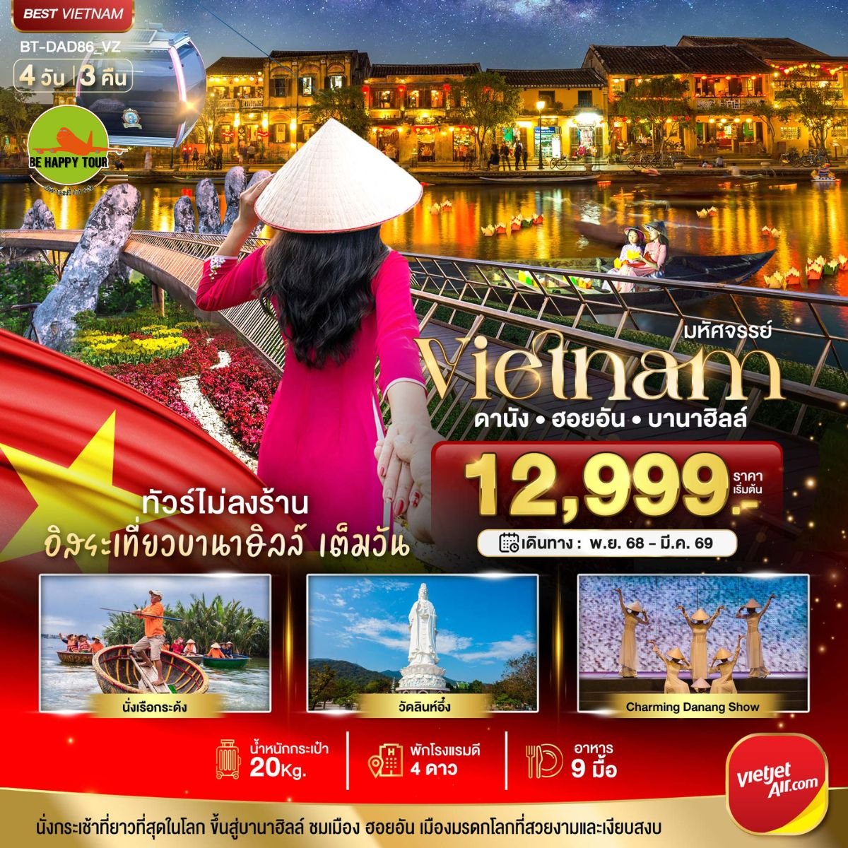เดินทาง ธ.ค.68 - มี.ค. 69 | โดยสายการบิน THAI VIET JET (VZ) | • Wonder Park • Apec Park • สะพานมังกร • หาดหมีเคว • CHARMING SHOW • บาน่าฮิลล์เต็มวัน • นั่งกระเช้าไฟฟ้าขึ้นสู่บาน่าฮิลล์ • สะพานมือสีทอง • สวนสนุกแฟนตาซี หมู่บ้านฝรั่งเศส • โซนใหม่ Eclipse Square • วัดลินห์อึ๋ง • Café Son Tra Marina • หมู่บ้านกั๊มทาน • นั่งเรือกระด้ง • เมืองโบราณฮอยอัน • ล่องเรือลอยกระทง • ช้อปปิ้งตลาดฮาน