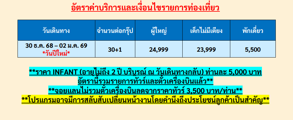 เดินทาง ธ.ค.68 | โดยสายการบิน AIR ASIA (FD) | • ลาวไก • ซาปา • โบสถ์หินซาปา ทะเลสาบซาปา • ช้อปปิ้งไนซ์มาเก็ต • ซาปา • นั่งรถรางขึ้นกระเช้าฟานซีปัน • อิสระท่องเที่ยวตามอัธยาศัย • ฮานอย • ร้านเยื่อไผ่ • Mega Grand World Hanoi • ช้อบปิ้งถนน 36 สาย • ทะเลสาบคืนดาบ • สะพานแสงอาทิตย์ • วัดหง๊อกเซิน • นิงห์บิงห์ • ล่องเรือตามก๊ก • ฮานอย