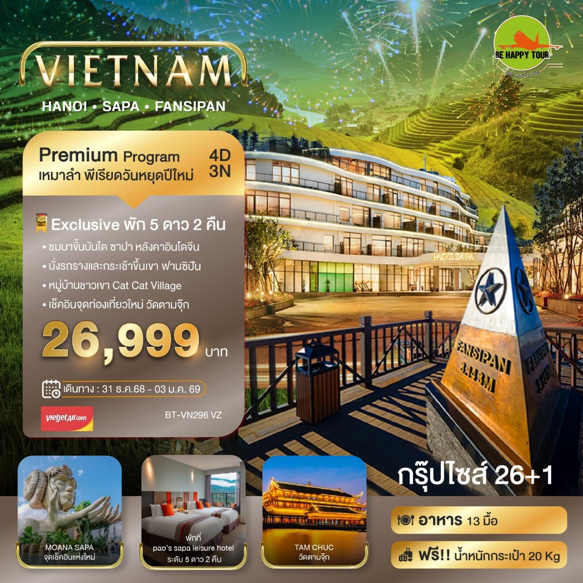 บินเหมาลำ ฉลองเทศกาลปีใหม่ ซาปา ฮานอย ฟานซีปัน วัดตามจุ๊ก พักหรู 5 ดาว 2 คืน 4 วัน 3 คืน (VZ) (NEWYEAR26)
