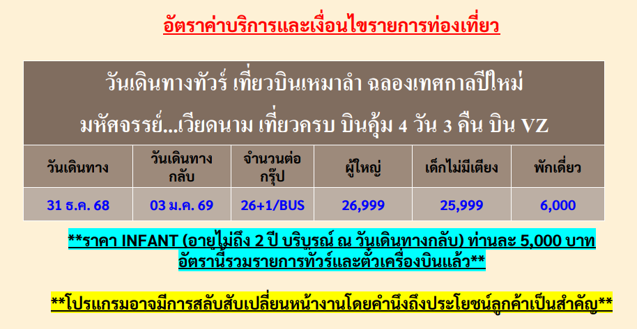 เดินทาง ธ.ค.68 | โดยสายการบิน THAI VIET JET (VZ) | • ลาวไก • ซาปา • โบสถ์หินซาปา • หมู่บ้านชาวเขากั๊ตกั๊ต • ซาปา • นั่งรถรางขึ้นกระเช้าฟานซีปัน • Moana Sapa • ช้อปปิ้งไนซ์มาเก็ต • ฮานอย • ร้านเยื่อไผ่ • จตุรัสบาดิ่ญ • ทะเลสาบคืนดาบ • สะพานแสงอาทิตย์ • วัดหง๊อกซิน • อิสระช้อปปิ้งถนน 36 สาย • ฮานาม • จุดเช็คอินแห่งใหม่ “วัดตามจุ๊ก” • ฮานอย • วัดเฉินก๊วก • ร้านผ้าไหม