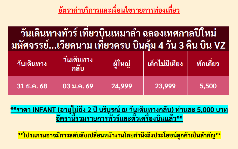 บินเหมาลำ ฉลองเทศกาลปีใหม่ ฮานอย ซาปา ตามด๋าว 4 วัน 3 คืน (VZ) (NEWYEAR26)
