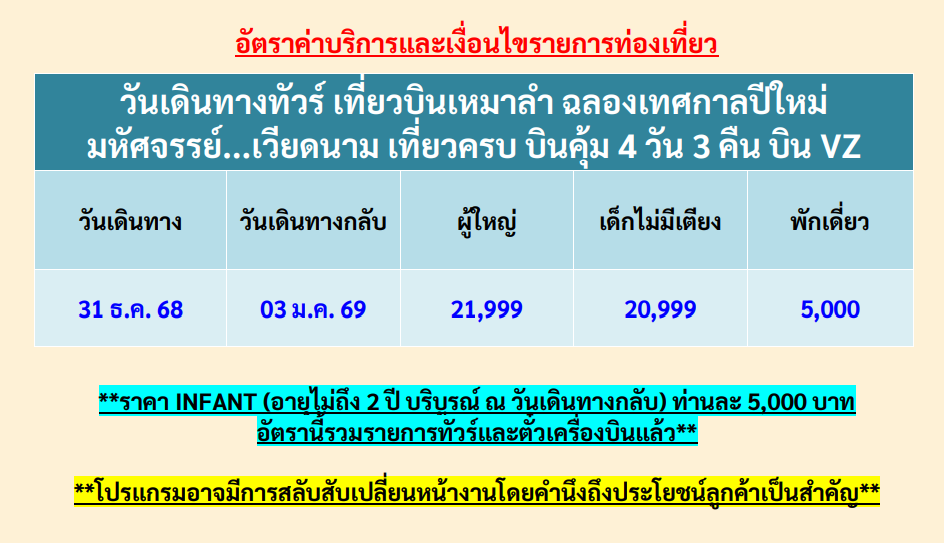 หมวดหมู่ : โดยสายการบิน ,  THAI VIET JET (VZ) ,  ทัวร์เทศกาล ,  ทัวร์ปีใหม่ ,  Vietnam ,  North vietnam ,