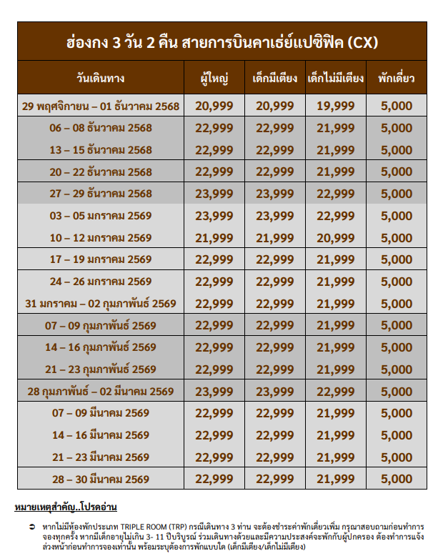เดินทาง ธ.ค.68 - มี.ค. 69 | โดยสายการบินCATHAY PACIFIC (CX) | • กระเช้านองปิง • พระใหญ่เทียนถาน • ซิตี้เกทเอ้าทเลท • สวนสนุกดิสนีย์แลนด์ (เต็มวัน) • ยอดเขาวิคตอเรียพีค • รถรางพีคแทรม • เจ้าแม่กวนอิมรีพัสล์เบย์ • โรงงานจิลเวลรี่ • ร้านหยก • วัดแชงกงหมิว • ย่านจิมซาจุ่ย • สนามบินเชคแล็ปก็อก