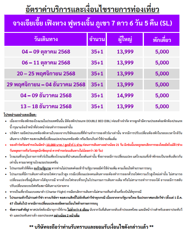 เดินทาง ธ.ค. 68 | โดยสายการบิน THAI LION AIR (SL) | • เมืองจางเจียเจี้ย • เมืองเฟิงหวง • เมืองโบราณเฟิงหวง • ล่องเรือแม่น้ำถัวเจียง • เมืองฟูหรงเจิ้น • เมืองโบราณฟูหรงเจิ้น • เมืองจางเจียเจี้ย • ร้านยา (บัวหิมะ) • ภูเขาเจ็ดดาว • จุดชมวิวพื้นกระจก 1520• ร้านชา • ร้านหยก • ICE AND SNOW WORLD (เมืองหิมะ) • ตึกมหัศจรรย์ 72 ชั้น • ร้านยางพารา • พิพิธภัณฑ์ภาพวาดหินทราย • สนามบินจางเจียเจี้ยต้าหย่ง
