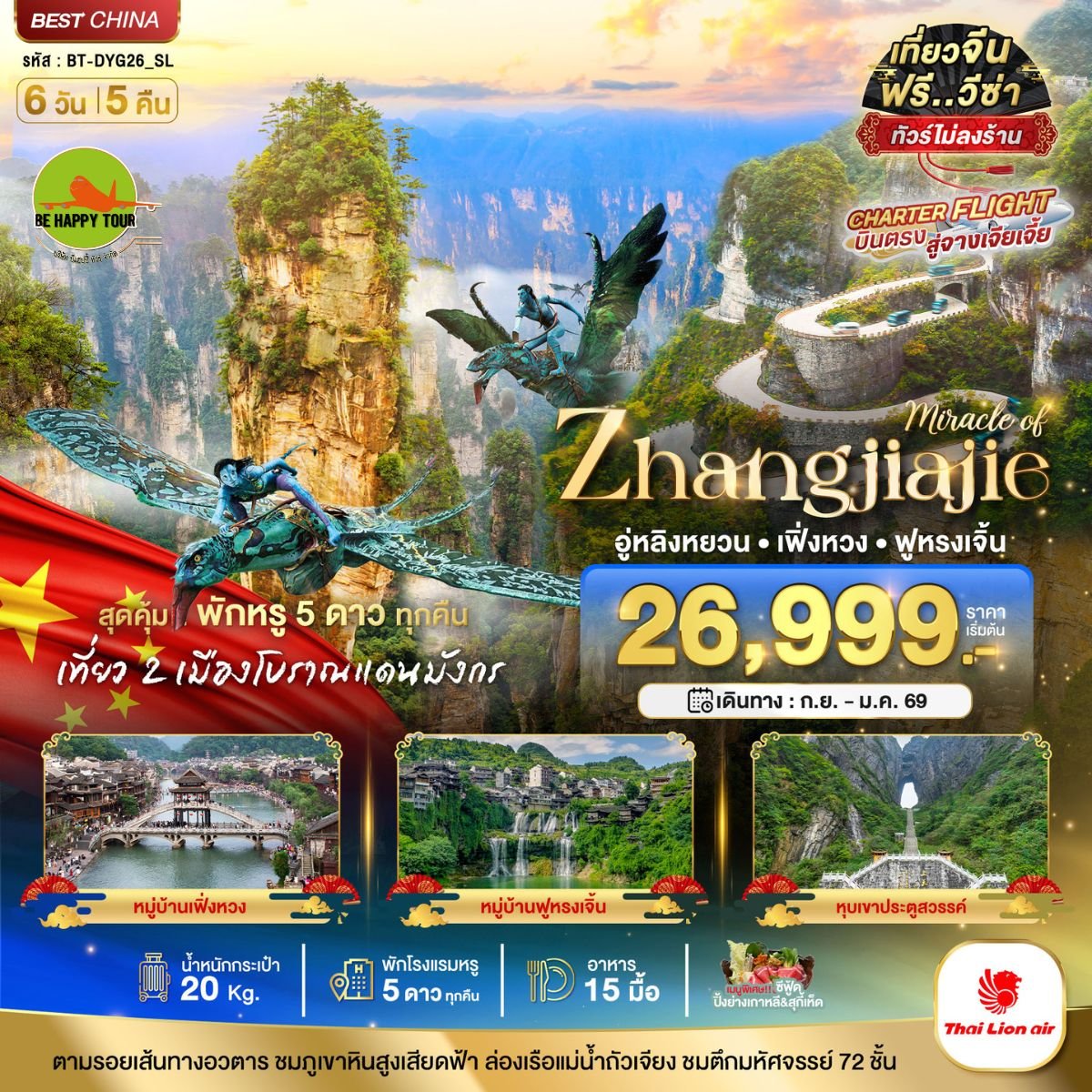 เดินทาง พ.ย.68 - ม.ค 69 | โดยสายการบิน THAI LION AIR (SL) | • เมืองจางเจียเจี้ย • ตึกมหัศจรรย์ 72 ชั้น • เมืองเฟิงหวง • เมืองโบราณเฟิงหวง • สะพานสายรุ้ง • ถนนแผ่นหินโบราณ • ล่องเรือแม่น้ำถัวเจียง • ใส่ชุดชนเผ่าท้องถิ่น • ชมวิวกลางคืนเมืองโบราณเฟิงหวง • เมืองฟูหรงเจิ้น • เมืองโบราณฟูหรงเจิ้น • ถนนคนเดิน Wuli Slate Street • ทางเดินทะลุน้ำตกฟูหรง • ชมวิวกลางคืนเมืองโบราณฟูหรงเจิ้น • เมืองจางเจียเจี้ย • ภูเขาเทียนเหมินซาน • ถ้ำประตูสวรรค์ • ทางเดินกระจก • เมืองอู่หลิงหยวน • อุทยานจางเจียเจี้ย • ลำธารแส้ม้าทอง • หุบเขาภาพเขียนสิบลี้ • เขตอนุรักษ์ธรรมชาติเทียนจื่อซาน • ลิฟท์แก้วไป่หลง • ภูเขาฮัลเลลูย่าห์ (หุบเขาอวตาร) • สะพานอันดับหนึ่งใต้ฟ้า • สวนจอมพลเฮ่อหลง • ถนนซีปู้เจีย • พิพิธภัณฑ์ภาพวาดหินทราย • ล่องเรือทะเลสาบเป่าเฟิ่งหู • OPTION: สะพานกระจกจางเจียเจี้ย / แว่น VTR นั่งบอลลูนเทียม • สนามบินจางเจียเจี้ยต้าหย่ง