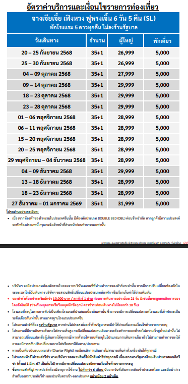เดินทาง พ.ย.68 - ม.ค 69 | โดยสายการบิน THAI LION AIR (SL) | • เมืองจางเจียเจี้ย • ตึกมหัศจรรย์ 72 ชั้น • เมืองเฟิงหวง • เมืองโบราณเฟิงหวง • สะพานสายรุ้ง • ถนนแผ่นหินโบราณ • ล่องเรือแม่น้ำถัวเจียง • ใส่ชุดชนเผ่าท้องถิ่น • ชมวิวกลางคืนเมืองโบราณเฟิงหวง • เมืองฟูหรงเจิ้น • เมืองโบราณฟูหรงเจิ้น • ถนนคนเดิน Wuli Slate Street • ทางเดินทะลุน้ำตกฟูหรง • ชมวิวกลางคืนเมืองโบราณฟูหรงเจิ้น • เมืองจางเจียเจี้ย • ภูเขาเทียนเหมินซาน • ถ้ำประตูสวรรค์ • ทางเดินกระจก • เมืองอู่หลิงหยวน • อุทยานจางเจียเจี้ย • ลำธารแส้ม้าทอง • หุบเขาภาพเขียนสิบลี้ • เขตอนุรักษ์ธรรมชาติเทียนจื่อซาน • ลิฟท์แก้วไป่หลง • ภูเขาฮัลเลลูย่าห์ (หุบเขาอวตาร) • สะพานอันดับหนึ่งใต้ฟ้า • สวนจอมพลเฮ่อหลง • ถนนซีปู้เจีย • พิพิธภัณฑ์ภาพวาดหินทราย • ล่องเรือทะเลสาบเป่าเฟิ่งหู • OPTION: สะพานกระจกจางเจียเจี้ย / แว่น VTR นั่งบอลลูนเทียม • สนามบินจางเจียเจี้ยต้าหย่ง