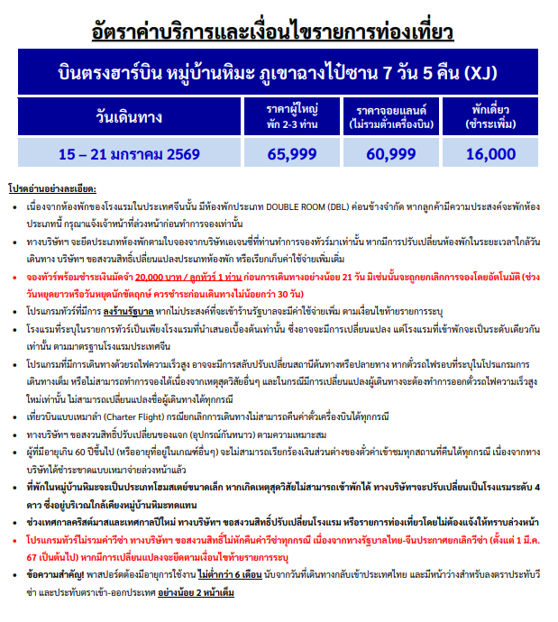 เดินทาง ม.ค. 69 | โดยสายการบิน AIR ASIA X (XJ)| • ร้านเสื้อกันหนาว • เมืองยาบูลี่ • ขี่รถตะลุยหิมะ SNOW MOBILE • หมู่บ้านหิมะ (CHINA’S SNOW TOWN) • ถนนเสวี่ยยุ่นเจีย • DREAM HOUSE • พิพิธภัณฑ์เมืองหิมะ • ไปรษณีย์เมืองหิมะ • จุดชมวิวภาพวาดสิบลี้และป่าสนหิมะ • เมืองตุนหัว •เมืองตุนหัว • สวนกวางเรนเดียร์ • เขตอุทยานฉางไป๋ • เขาฉางไป๋ซาน • ทะเลสาบเทียนฉือ • สถานีรถไฟความเร็วสูง • เมืองฮาร์บิ้น • เทศกาลแกะสลักหิมะ และน้ำแข็งนานาชาติแห่งเมืองฮาร์บิน • เกาะพระอาทิตย์ • โบสถ์เซนโซเฟีย • อนุเสาวรีย์ฝั่งหง • สวนสตาลิน • ถนนจงหยาง • ตุ๊กตาหิมะยักษ์