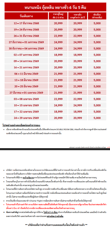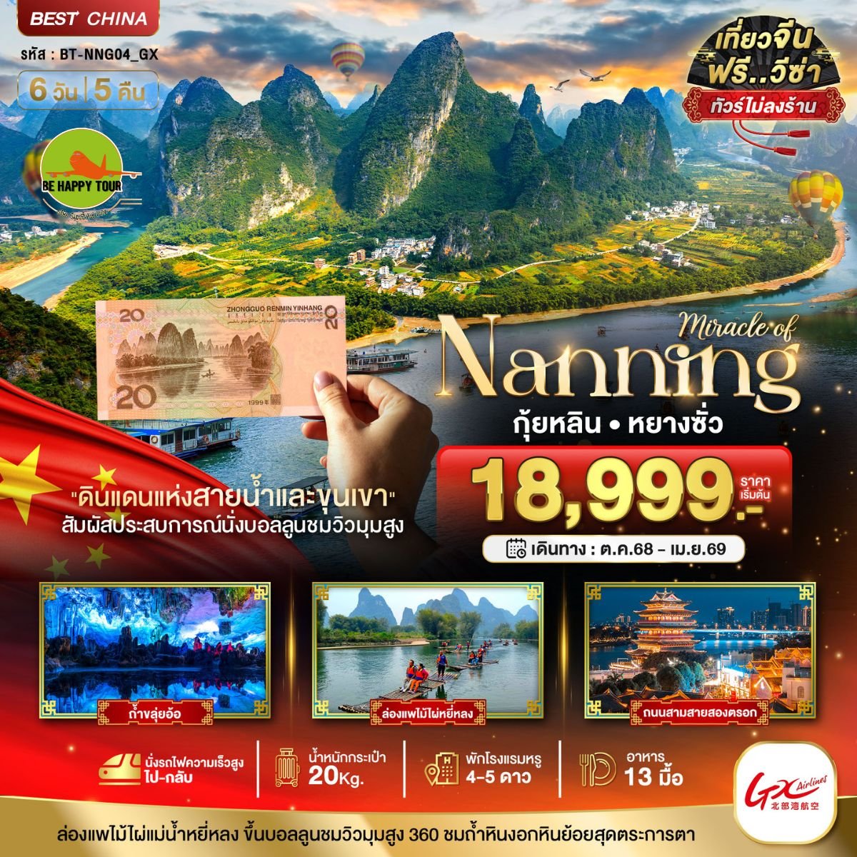 เดินทาง ต.ค.-เม.ย. 69 | โดยสายการบิน GUANG BEIBU GULF AIRLINES (GX) | • เมืองหนานหนิง • พิพิธภัณฑ์กว่างสี • ถนนคนเดินหนานหนิง • สถานีรถไฟความเร็วสูงหนานหนิง • เมืองกุ้ยหลิน • ถ้ำขลุ่ยอ้อ • เขางวงช้าง • เจดีย์เงิน เจดีย์ทอง • โชว์ Mirage Guilin Night Show • เมืองหยางซั่ว • ล่องแพไม้ไผ่แม่น้ำหยู่หลง • ชมเขาวงพระจันทร์ • ถนนฝรั่งซีเจีย • OPTION: SHIWAI TAOYUAN • นั่งกระเช้าสู่ยอดเขาหลู่ยี่ • จุดชมวิวภูเขาหลู่ยี่ฟง • นั่งบอลลูนชมวิว 360 องศา • เมืองโบราณซิงผิง • จุดชมวิวธนบัตร 20 หยวน • ชมการแสดงนกจับปลา • สถานีรถไฟความเร็วสูงหยางซั่ว • เมืองหนานหนิง • ถนนซานเจียเหลียงเซียง
