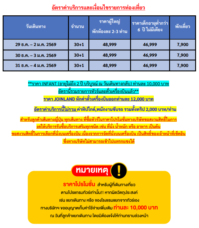 เดินทาง ม.ค. 69 | โดยสายการบิน AIR ASIA X (XJ) | • วัดเบียวโดอิน • ถนนชาเขียว อุจิ • มิตซุยเอ้าเล็ต • เทศกาลประดับไฟนาบานาโนะซาโตะ • หมู่บ้านชิราคาวาโกะ • ทาคาสึสกีรีสอร์ท • อิออนมอลล์ • ปราสาทโอซาก้า • ช้อปปิ้งปลอดภาษี • ช้อปปิ้งชินไซบาชิ