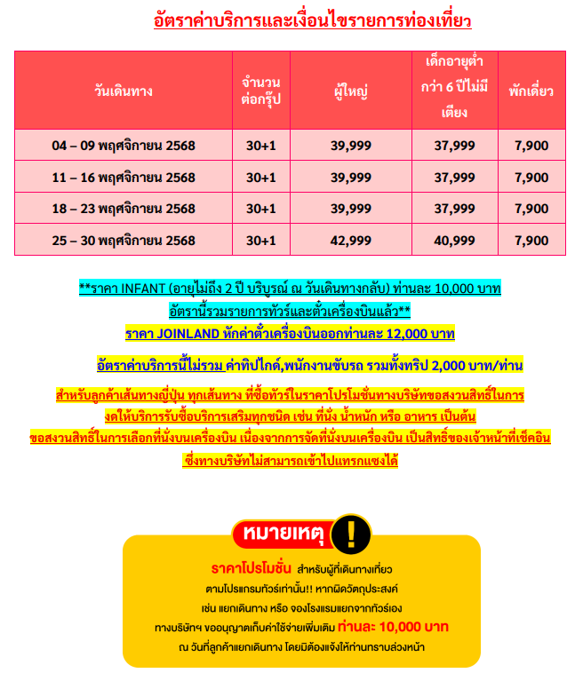 เดินทาง พ.ย. 68 | โดยสายการบิน AIR ASIA X (XJ) | • วัดเอคันโดะ • เทศกาลไฟนาบานาโนะซาโตะ • วัดโอสุคันนง • หมู่บ้านชิราคาวาโกะ • เมืองทาคายาม่า • สะพานนาคะบาชิ • ถนนเมืองเก่าซันมาจิ • กระเช้าชินโฮทากะ • เมืองฮิดะ ฟุรุคาวะ • ชมเมืองปลาคาร์ฟ • อิออน • เกียวโต • ศาลเจ้เฮอัน • ช้อปปิ้งปลอดภาษี • ชินไซบาชิ