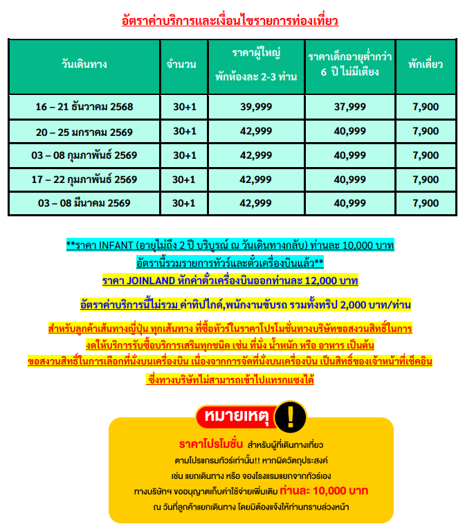 เดินทาง ธ.ค.- มี.ค.68 | โดยสายการบิน AIR ASIA X (XJ) | • ปราสาทโอซาก้า • มิตซุยเอ้าเล็ต • กิฟุ • ทาคาสึสโนว์ปาร์ค • หมู่บ้านชิราคาวาโกะ • อิออนมอลล์ • วัดเบียวโดอิน • ถนนชาเขียว อุจิ • กิจกรรมชงชาญี่ปุ่น • ศาลเจ้าเฮอัน • ช้อปปิ้งชินไซบาชิ • อิสระช้อปปิ้งตามอัธยาศัย ไม่รวมค่ารถบริการรับ – ส่งและค่าเข้าสถานที่ต่างๆ