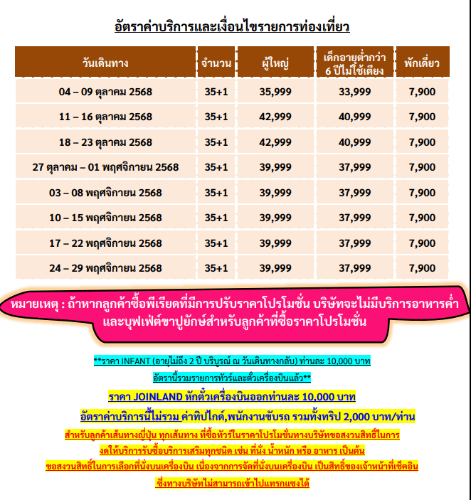 เดินทาง ต.ค.- พ.ย.68 | โดยสายการบิน AIR ASIA X (XJ) | • พระใหญ่อะตะมะ ไดบุตสึ • อิออน มอลล์ • บ่อน้ำสีฟ้า • น้ำตกชิราฮิเกะ • สวนฮิราโอกะ • บุฟเฟต์ขาปูยักษ์ 3 ชนิด • ช้อปปิ้งปลอดภาษี • คลองโอตารุ • พิพิธภัณฑ์กล่องดนตรี • หอนาฬิกาไอน้ำโบราณ • ถนนซาไกมาจิ • มิตซุยเอ้าท์เล็ต • ถนนทานุกิโคจิ • อิสระช้อปปิ้งตามอัธยาศัย ไม่มีรถบริการรับ – ส่ง