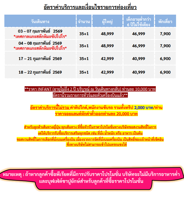 เดินทาง ก.พ. 69 | โดยสายการบิน AIR ASIA X (XJ) | • เมืองซัปโปโร • พระใหญ่อะตะมะ ไดบุตสึ • เมืองอาซาฮิกาว่า • อิออน มอลล์ • ลานกิจกรรมหิมะ • สวนสัตว์อาซาฮิยาม่า • ย่านซูซูกิโนะ • บุฟเฟต์ขาปูยักษ์ 3 ชนิด • ช้อปปิ้งปลอดภาษี • เทศกาลน้ำแข็งริมทะเลสาบ Lake Shikotsu Ice Festival • มิตซุยเอ้าท์เล็ท • ถนนทานุกิโคจิ