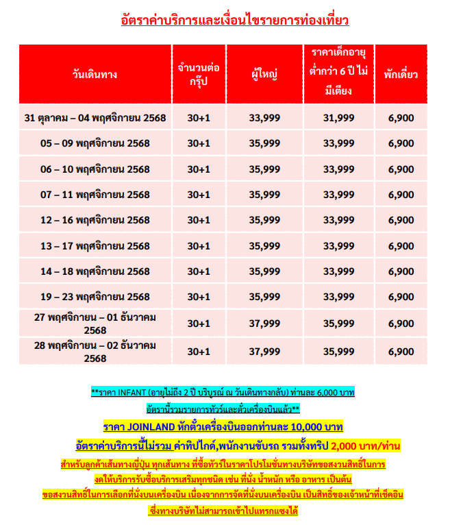 เดินทาง พ.ย.- ธ.ค. 68 | โดยสายการบิน AIR ASIA X (XJ) | • เมืองโตเกียว • วัดอาซากุสะ • ถนนนากามิเสะ • เมืองเก่าคาวาโกเอะ • หอระฆังโทกิโนะคาเนะ • สวนโชวะคิเอน • อปปิ้งปลอดภาษี • อุโมงค์เมเปิ้ล โมมิจิ ไคโร • เมืองโตเกียว • โอไดบะ • หุ่นยนต์กันดั้ม • อิสระช้อปปิ้งและท่องเที่ยวตามอัธยาศัย ไม่มีบริการรถรับ - ส่ง • ตลาดปลาสึกิจิ • ช้อปปิ้งชินจูกุ • ชิซุย เอ้าท์เล็ท
