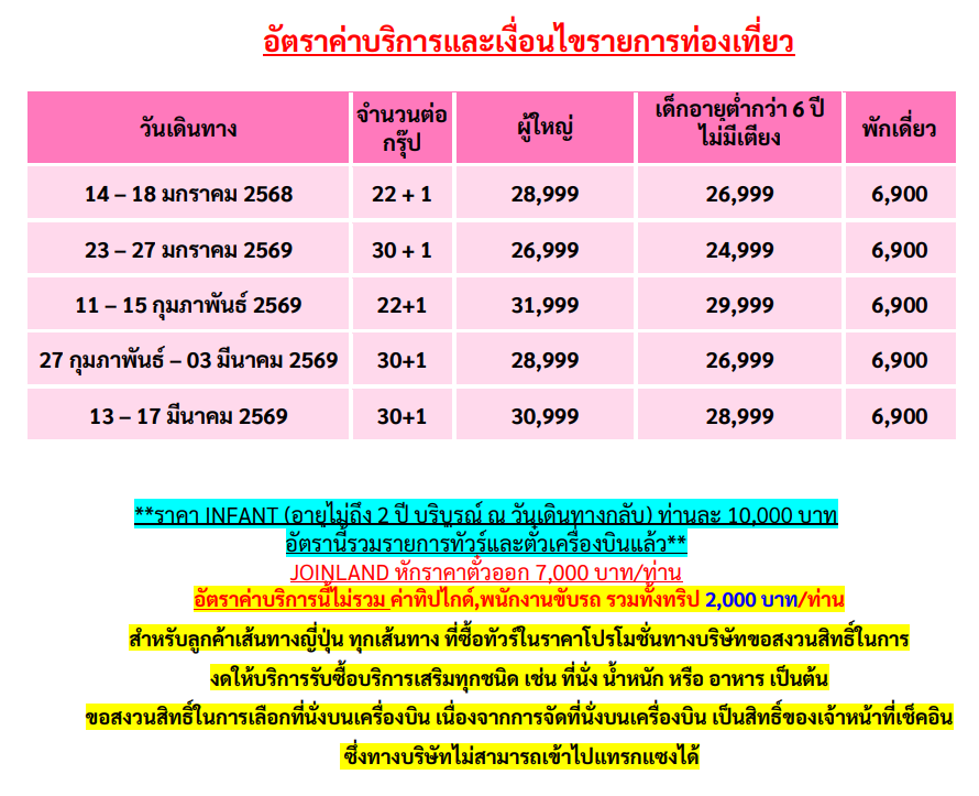 เดินทาง ม.ค.- มี.ค. 69 | โดยสายการบิน THAI VIET JET (VZ) | • เมืองฟุกุโอกะ • ศาลเจ้าดาไซฟุ • หมู่บ้านยูฟุอินฟลอร์รัล • ทะเลสาบคินริน • เมืองเบปปุ • บ่อยูมิ จิโกกุ • เมืองมิยะซะกิ • ศาลเจ้าอามาโนะ อิวาโตะ • หุบเขาทาคาชิโฮ • ช้อปปิ้งย่านชิโมโทริ • ผ่านชมปราสาทคุมาโมโต้ • ฟาร์มสตรอเบอร์รี่ • โทสุ พรีเมี่ยมเอ้าท์เล็ท • DUTY FREE • ช้อปปิ้งย่านเทนจิน