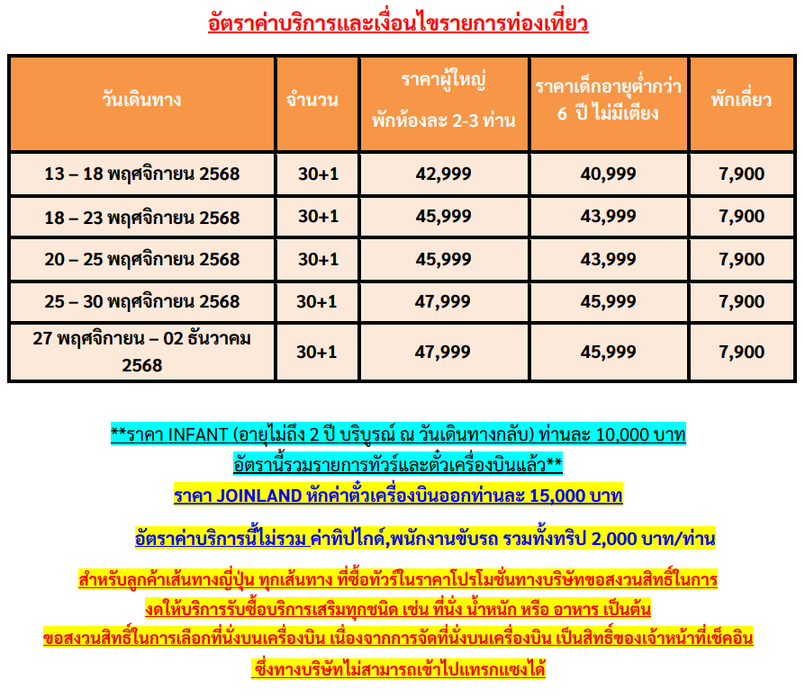 เดินทาง พ.ย.-ธ.ค.68 | โดยสายการบิน AIR ASIA X (XJ) | • เมืองเกียวโต • วัดโทฟุคุจิ • เมืองนาโกย่า • เทศกาลประดับไฟนาบานาโนะซาโตะ • หมู่บ้านชิราคาวาโกะ • เมืองทาคายาม่า • สะพานนาคะบาชิ • ถนนเมืองเก่าซันมาจิ สถานีรถไฟมัตสึโมโต้ • เมืองนากาโนะ • กระเช้าชินโฮทากะ • ปราสาทมัตสึโมโต้ • เมืองยามานาชิ • ศูนย์จำลองแผ่นดินไหว • อุโมงค์เมเปิ้ลโมมิจิ ไคโร • เมืองโตเกียว • ช้อปปิ้งชินจูกุ