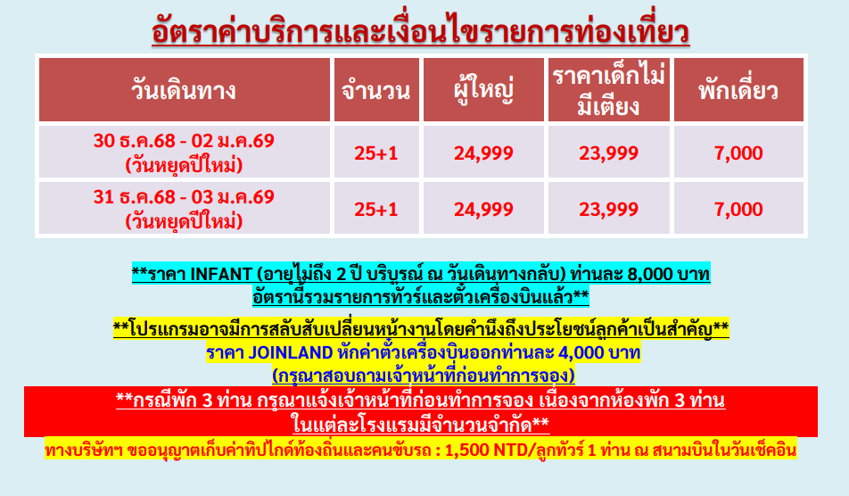 เดินทาง ธ.ค.- ม.ค.69 | โดยสายการบิน THAI LION AIR (SL) | • วัดต้าซี • เมืองไถจง • ไถจงนท์มาร์เก็ต • เมืองหนานโถว • ชิมชาอู่หลง • วัดเหวินหวู่ • ล่องเรือชมทะเลสาบสุริยันจันทรา • เมืองไทเป • ร้านพายสับประรด • ซีเหมินติงไนท์มาร์เก็ต • Germanium • เมืองนิวไทเป • หมู่บ้านชาวประมงหลากสี • หมู่บ้านโบราณจิ่วเฟิ่น • ปล่อยโคมลอยเส้นทางรถไฟสายผิงซี • เมืองไทเป • เค้าดาวน์บริเวณตึกไทเป 101 (ไม่รวมค่าขึ้นตึกชั้น 89) • ศูนย์เครื่องสำอาง • วัดหลงซาน • อนุสรณ์สถานเจียงไคเช็ค • เมืองนิวไทเป • น้ำพุร้อนเป่ยโถว • ถนนคนเดินตั้นสุ่ย • เมืองเถาหยวน