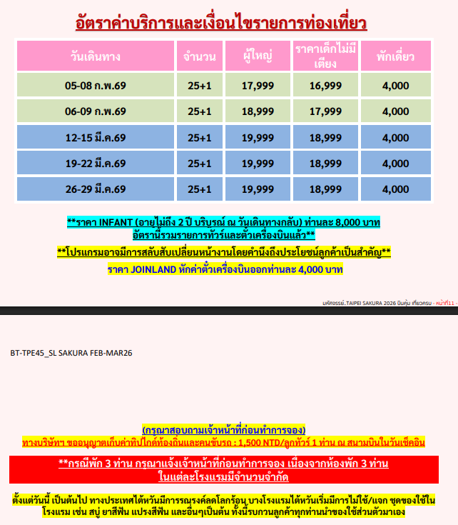 เดินทาง ก.พ.- มี.ค. 69 | โดยสายการบิน THAI LION AIR (SL) | • เมืองหนานโถว • ชิมชาอู่หลงวัดเหวินหวู่ • ล่องเรือทะเลสาบสุริยันจันทรา • ถนนคนเดินอิต๋าเช่า • ร้านพายสับประรด • หมู่บ้านปีศาจซีโถว • เมืองไทเป • Germanium • ซีเหมินติงไนท์มาร์เก็ต • ศูนย์เครื่องสำอาง • อนุสรณ์สถานเจียงไคเช็ค • ตึกไทเป101 (ไม่รวมค่าขึ้นตึกชั้น89) •เมืองนิวไทเป • วัดอู๋จีเทียนหยวน • ถนนคนเดินตั้นสุ่ย • เมืองไทเป • กลอเรียเอ้าท์เล็ท • เมืองเถาหยวน