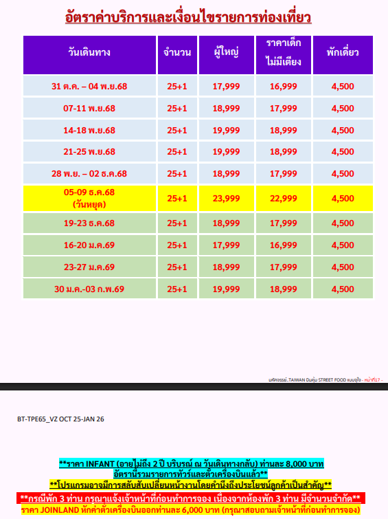 เดินทาง ธ.ค. - ม.ค 69 | โดยสายการบิน THAI VIET JET (VZ) | ● วัดต้าซี(วัดไล่ความจน) ● เมืองไถจง ตลาดไถจงไนท์มาร์เก็ต ● เมืองหนานโถว ● ชิมชาอู่หลง ● วัดเหวินหวู่ ● ล่องเรือชมทะเลสาบสุริยันจันทรา ● วัดพระถังซำจั๋ง ● เมืองเถาหยวน ● เถาหยวนไนท์มาร์เก็ต ● เมืองไทเป ● ร้านพายสับประรด ● เมืองนิวไทเป ● หมู่บ้านโบราณจิ่วเฟิ่น ● หมู่บ้านชาวประมงหลากสี ● เมืองไทเป ● วัดหลงซาน ● ซีเหมินติงไนท์มาร์เก็ต ● Germanium ● เมืองนิวไทเป ● ถนนคนเดินตั้นสุ่ย ● น้ำพุร้อนเป่ยโถว ● สวนดอกไม้ซื่อหลิน ● ตลาดซื่อหลินไนท์มาร์เก็ต ● ศูนย์เครื่องสำอาง ● อนุสรณ์สถานเจียงไคเช็ค ● ตึกไทเป101(ไม่รวมค่าขึ้นตึกชั้น89) ตลาดปลาไทเป ● เมืองเถาหยวน ● กลอเรีย เอ้าท์เล็ท