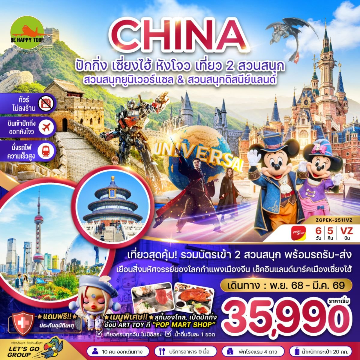 จีน ปักกิ่ง เซี่ยงไฮ้ หังโจว สวนสนุกยูนิเวอร์แซล&ดิสนีย์แลนด์ (ไม่ลงร้าน-รวมบัตรสวนสนุก-นั่งรถไฟความเร็วสูง)(6วัน5คืน)(VZ) (JAN-MAR26)