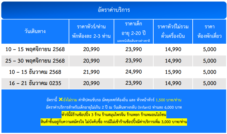 เดินทาง พ.ย.- ธ.ค 69 | โดยสายการบิน SICHUAN AIRLINES (3U) | • เมืองฉงชิ่ง • เมืองเฉียนเจียง • แกรนด์แคนยอน • เจ้าแม่กวนอิมแกะสลักบนผาหิน • ล่องเรือชมความงามแม่น้ำใต้ดินภูฮัว • เมืองโบราณจัวสุ่ย • สะพานแขวนฟู่ซิงเฉียว • เมืองอู่หลง • ระเบียงแก้วอู่หลง • อุทยานแห่งชาติหลุมฟ้า สะพานสวรรค์ • ลิฟต์แก้ว • อุทยานเขานางฟ้า • ถ้ำเลาจุงต้ง • ถนนคนเดินเจียงฟางเป่ย • อาคารตะเกียบ • ตลาดหงหยาต้ง • เมืองโบราณสือโข่ว • วัดเจดีย์หงอัน • ห้าง THE RING • รถไฟวิ่งทะลุตึก • มหาศาลาประชาคม