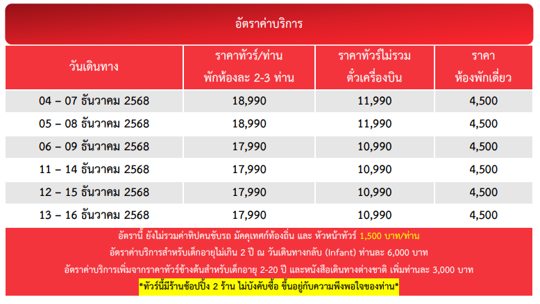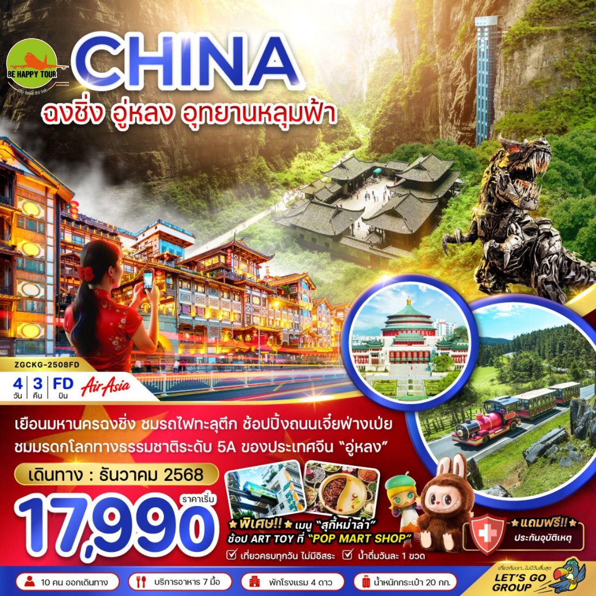 เดินทาง ธ.ค 68 | โดยสายการบิน AIR ASIA (FD) | • เมืองฉงชิ่ง • เมืองอู่หลง • ระเบียงแก้วอู่หลง • อุทยานแห่งชาติหลุมฟ้า สะพานสวรรค์ • ลิฟต์แก้ว • อุทยานเขานางฟ้า • เมืองฉงชิ่ง • ไคว่ชิงโหลชั้น 1 กลายเป็นชั้นที่ 22 • อาคารตะเกียบ • มหาศาลาประชาคม • ตลาดหงหยาต้ง รถไฟวิ่งทะลุตึก • ถนนคนเดินเจี๋ยฟ่างเป่ย • ป๊อปมาร์ท