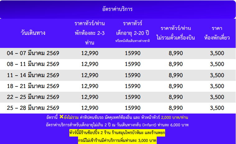 เดินทาง มี.ค. 69 | โดยสายการบิน KUNMING AIRLINES (KY) | • เมืองคุนหมิง • เมืองถ่านเตี้ยน • ภูเขาหิมะเจี้ยวจื่อ • นั่งกระเช้าไฟฟ้าเจี้ยวจื่อ • สวนผลไม้ตามฤดูกาล • เมืองคุนหมิง • วัดหยวนทง • น้ำตกเมืองคุนหมิง • ซุ้มประตูม้าทองและซุ้มประตูไก่หยก • ถนนคนเดินหนานผิงเจี่ย • POP MART • เขาซีซาน