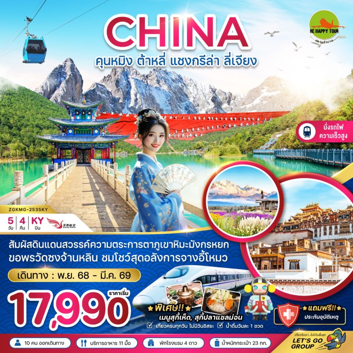 เดินทาง พ.ย. - มี.ค. 69 | โดยสายการบิน KUNMING AIRLINES (KY) | • เมืองคุนหมิง • นั่งรถไฟความเร็วสูงคุณหมิง-ต้าหลี่ • เมืองต้าหลี่ • วัดเจ้าแม่กวนอิม • เมืองเก่าต้าหลี่ • เจดีย์สามองค์แห่งวัดฉงเซิ่น • เมืองแชงกรี-ล่า – เมืองโบราณแชงกรี-ล่า • วัดซงจ้านหลิน • ช่องเขาแคบเสือกระโจน • เมืองลี่เจียง • สระน้ำมังกรดำ • เมืองเก่าลี่เจียง • ภูเขาหิมะมังกรหยก • โชว์จางอี้โหมว • ทะเลสาบไป๋สุยเหอ • สวนกาแฟริมฝั่งเมฆ • เมืองฉู่ฉง • เมืองคุนหมิง • เมืองโบราณกวนตู้