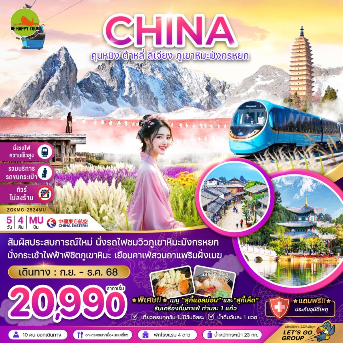 เดินทาง ธ.ค. 68 | โดยสายการบิน CHINA EASTERN AIRLINES (MU) | • เมืองต้าหลี่ • เมืองโบราณต้าหลี่ • ภูเขาหิมะมังกรหยก • โชว์จางอี้โหมว • อุทยานน้ำหยก • ทะเลสาบไป๋สุยเหอ • นั่งรถไฟชมวิวภูเขาหิมะมังกรหยก • สวนกาแฟริมฝั่งเมฆ • นั่งรถไฟความเร็วสูงลี่เจียง-คุนหมิง • ประตูม้าทองไก่มรกต • POP MART • ถนนคนเดินหนานผิงเจี่ย • สวนน้ำตกคุนหมิง • วัดหยวนทง • ย่านตึกเหลืองคุนหมิง