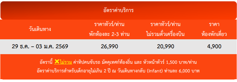 เดินทาง ธ.ค. 68 | โดยสายการบิน CHINA EASTERN AIRLINES (MU) | • เมืองคุนหมิง • เมืองต้าหลี่ • ทะเลสาบเอ๋อร์ไห่ • เมืองเก่าต้าหลี่ • วัดเจ้าแม่กวนอิม • เจดีย์สามองค์แห่งวัดฉงเซิ่น • เมืองลี่เจียง • สระน้ำมังกรดำ • เมืองเก่าลี่เจียง • รถไฟชมวิวภูเขาหิมะมังกรหยก • หุบเขาพระจันทร์สีน้ำเงิน • ทะเลสาบไป๋สู่เหอ • เมืองโบราณไป๋ซา • สวนกาแฟริมฝั่งเมฆ • สะพานกระจกแห่งลี่เจียง • นั่งรถไฟความเร็วสูง • ซุ้มประตูม้าทองไก่หยก • ถนนคนเดินหนานผิงเจีย • ตำหนักทองจินเตี้ยน • สวนน้ำตกคุนหมิง • วัดหยวนทง