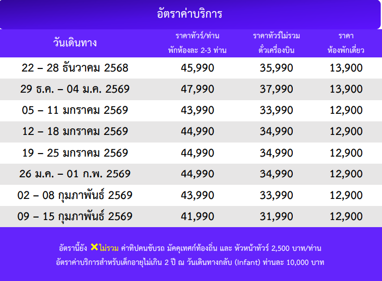 เดินทาง ธ.ค - ก.พ. 69 | โดยสายการบิน QINGDAO AIRLINES (QW) | • นั่งรถไฟความเร็วสูง ต้าเหลียน-ฮาร์บิน • เมืองฮาร์บิน • ร้านเครื่องกันหนาว • มนุษย์หิมะยักษ์ • เมืองฮาร์บิน • เทศกาลแกะสลักน้ำแข็ง • เมืองยาปู่ลี่ • ภาพวาดหิมะสิบลี้ • ลานสกียาปู่ลี่ • นั่งม้าลากเลื่อน • หมู่บ้านหิมะ • ถนนหมู่บ้านหิมะ • อนุสาวรีย์หมู่บ้านหิมะ • ไปรษณีย์หมู่บ้านหิมะ • ดรีมโฮม • ถนนคนเดินหมู่บ้านหิมะ • เมืองฮาร์บิน – โบสถ์เซนต์โซเฟีย • สวนสาธารณะซือต้าหลิน • อนุสาวรีย์ฝังหง • ถนนคนเดินฮาร์บิน • เกาะพระอาทิตย์ • นั่งรถไฟความเร็วสูงฮาร์บิน-ต้าเหลียน • เมืองต้าเหลียน • ถนนรัสเซีย