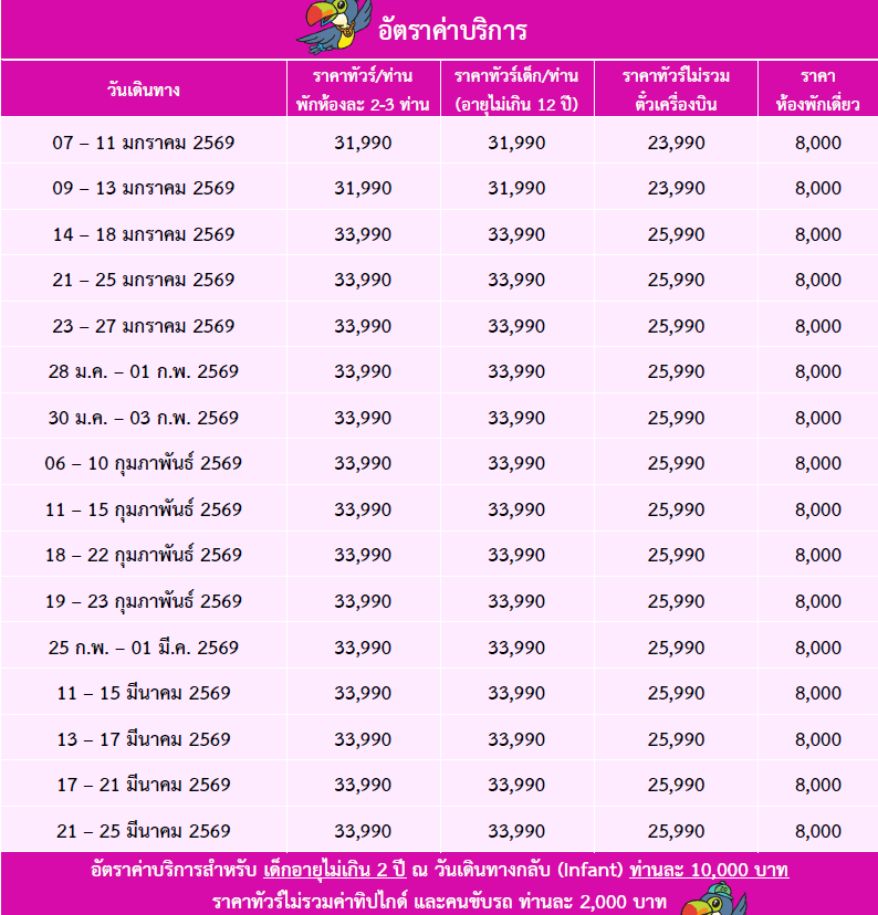 เดินทาง ม.ค - มี.ค 69 | โดยสายการบิน PEACH AIR (MM) | • เกียวโต • ศาลเจ้าฟูชิมิอินาริ • สะพานโทเก็ตสึเคียว • ป่าไผ่อาราชิยามะ • วัดคินคะคุจิ • ลานกิจกรรมหิมะ • ทาคายาม่า • ที่ทำการเก่าเมืองทาคายาม่า • เขตเมืองเก่าซันมาชิซึจิ • หมู่บ้านชิราคาวาโกะ • วัดคิโยมิสึ • ถนนสายกาน้ำชา • ปราสาทโอซาก้า • ชินไซบาชิ • ศาลเจ้านัมบะ ยาซากะ • ตลาดปลาคุโรมง • ริงกุ เอาท์เล็ท • อิออน มอลล์
