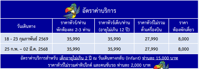 เดินทาง ก.พ.69 | โดยสายการบิน THAI VIET JET (VZ) | • เมืองฮาโกดาเตะ • สวนสาธารณะโกเรียวคาคุ • โกดังอิฐแดงริมน้ำ • เนินฮาจิมันซากะ • ศาลาประชาคมเก่าของฮาโกดาเตะ • นั่งกระเช้าไฟฟ้าสู่ภูเขาไฟอุสุซาน • ภูเขาไฟโชวะ • สวนหมีภูเขาไฟโชวะชินซัน • ทานุกิโคจิ • ลานสกีคิโรโระ • โอตารุ • คลองโอตารุ • พิพิธภัณฑ์กล่องดนตรี • ถนนซาไกมาชิ • ดิวตี้ฟรี • มิตซุย เอาท์เล็ต • อิสระช้อปปิ้งตามอัธยาศัย
