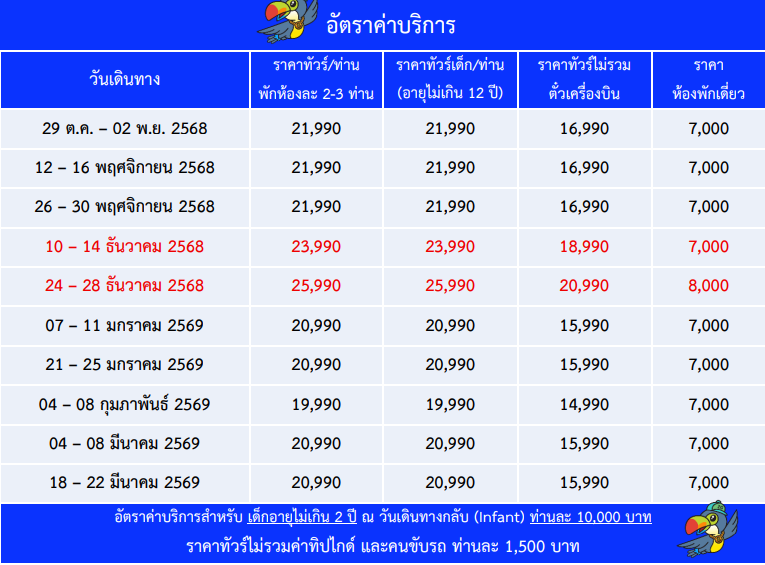 เดินทาง ธ.ค. - มี.ค 69 | โดยสายการบิน CHINA AIRLINES (CI) | • เมืองไถจง • ฟาร์มดอกไม้จงเซ่อ • ล่องเรือทะเลสาบสุริยันจันทราเกาะลาลู • วัดเหวินหวู่ • หมู่บ้านสายรุ้ง • ตลาดนัดกลางคืนเหวินฮั่ว • เมืองเจียอี้ • อุทยานแห่งชาติอาลีซาน • ร้านชาอู่หลง - รถไฟสายโบราณ • ร้านขนมพายสับปะรด • หมู่บ้านโบราณจิ่วเฟิ่น • บูราโนแห่งไต้หวัน • เมืองผิงซี • ซีเหมินติง • วัดหลงซาน • ตึกไทเป 101 • หมู่บ้านประวัติศาสตร์ซื่อซื่อหนันซุน • ร้านเครื่องสำอาง • อนุสรณ์สถานเจียงไคเชก • ห้างเอาท์เล็ทมิตซุย